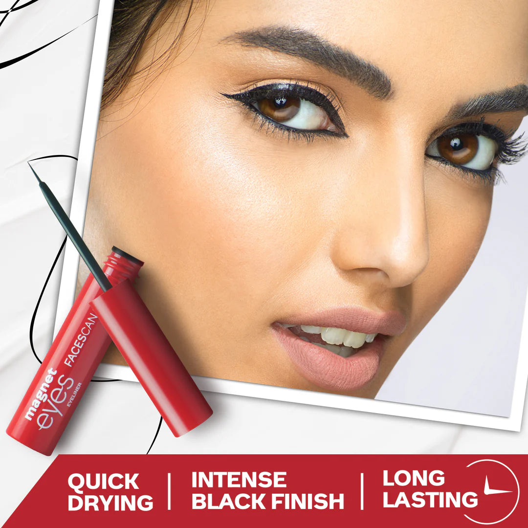 Magnet Eyes Eyeliner :This eyeliner has an intense black finish which gives you bold, gorgeous eyes. Its waterproof formulation glides on smoothly, dries quickly and lasts all day. Application is smooth and easy for perfect precision while adding definition to your eyes